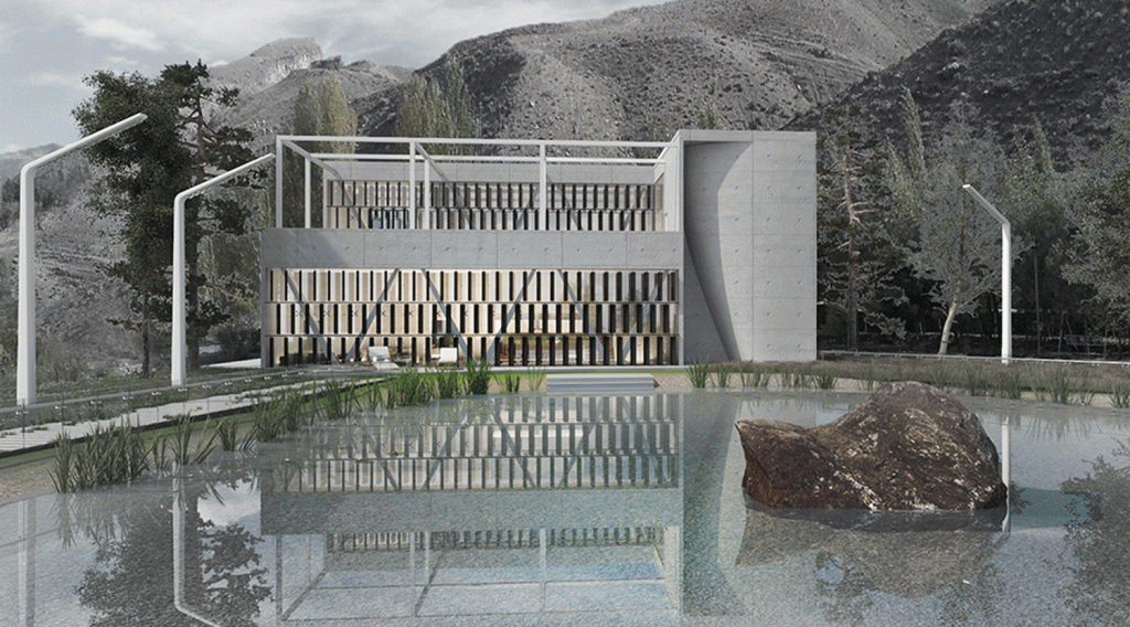Another feature of this project was that the volume from above overlap with the environment and in front contrasts with its perimeter environment. (Harmony from top with context and opposition by front and elevation with environment. )Because of this we decided to use green space on roof  for having harmony and use concrete for contrast. Another reason was client requirement. In such a way that the contradiction in its view will attract the attention of the observers to the building But from above you will not be in conflict with the nature around you.